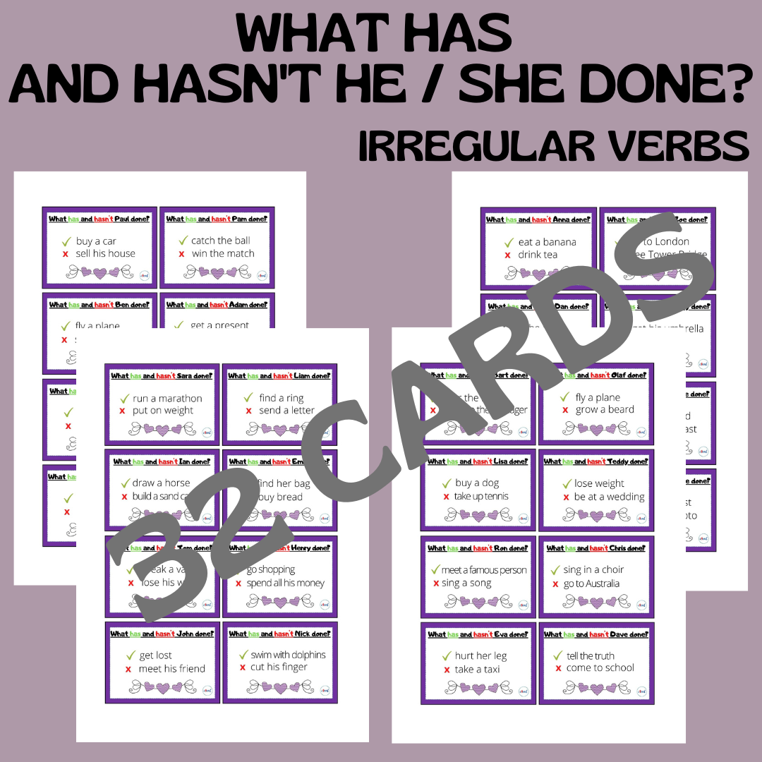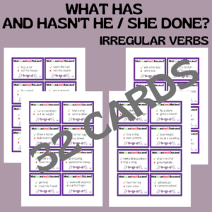 32 karty na przećwiczenie konstrukcji zdań w 3 os. l. poj. w czasie Present Perfect.