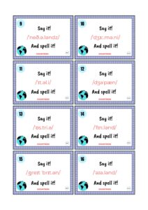 Na tych kartach znajdziecie 64 nazwy państw, ale wyłącznie w zapisie fonetycznym. Zadaniem ucznia jest (prawidłowo) odczytać słowo i przeliterować je (SAY IT! AND SPELL IT!).