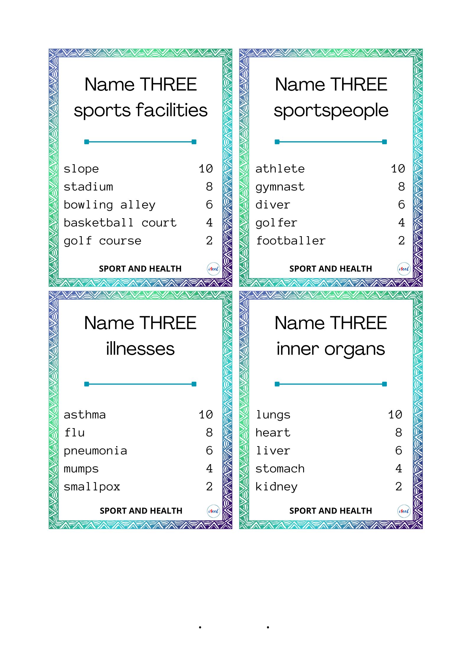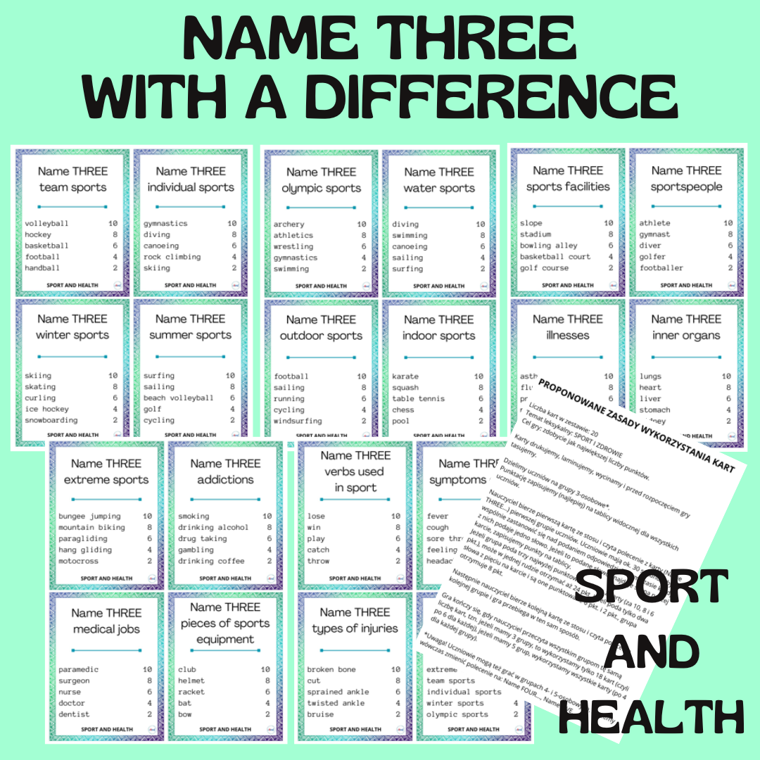 Cel gry: zdobycie jak największej liczby punktów oraz (przede wszystkim) powtórzenie i utrwalenie słownictwa z zakresu leksykalnego SPORT I ZDROWIE
