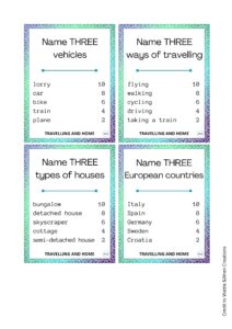 Nauczyciel bierze pierwszą kartę ze stosu i czyta polecenie z karty (Name THREE…) pierwszej grupie uczniów. Uczniowie mają ok. 30 sekund, aby wspólnie zastanowić się nad podaniem odpowiedzi. Po tym czasie każdy z nich podaje jedno słowo. Jeżeli to podane słowo znajduje się na naszej karcie, zapisujemy punkty na tablicy.