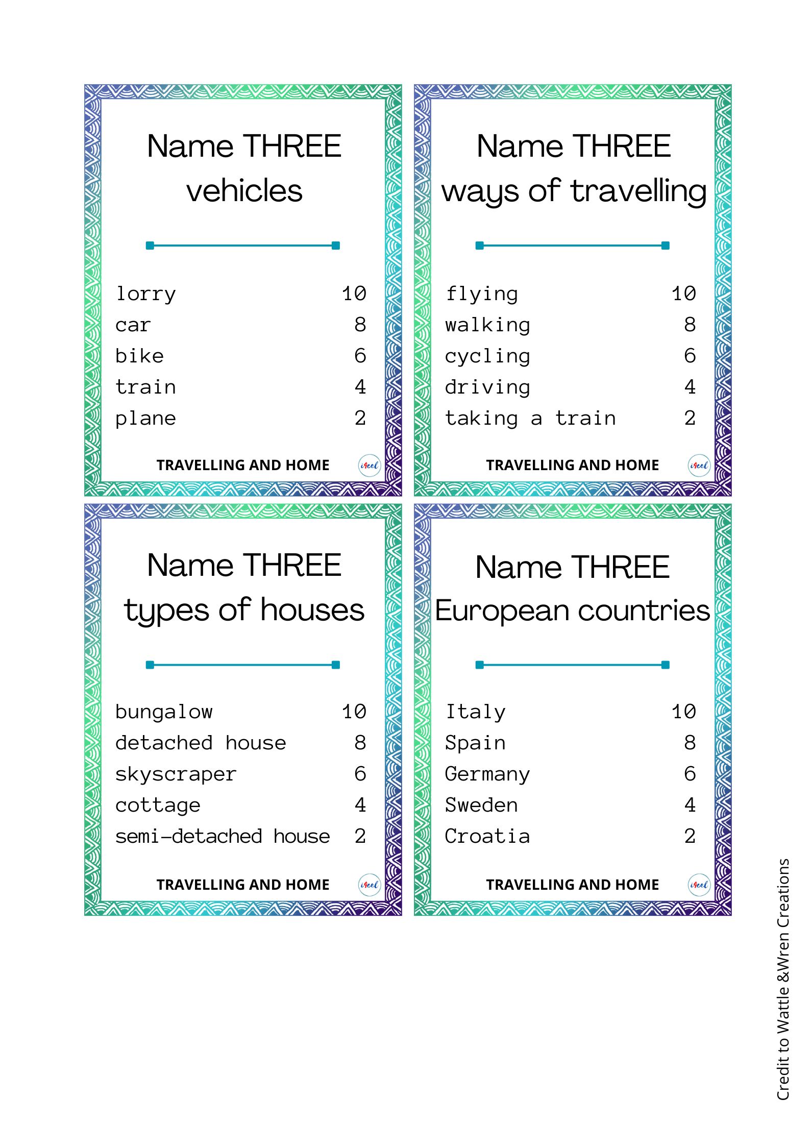 Cel gry: zdobycie jak największej liczby punktów oraz (przede wszystkim) powtórzenie i utrwalenie słownictwa z zakresu leksykalnego PODRÓŻOWANIE I DOM