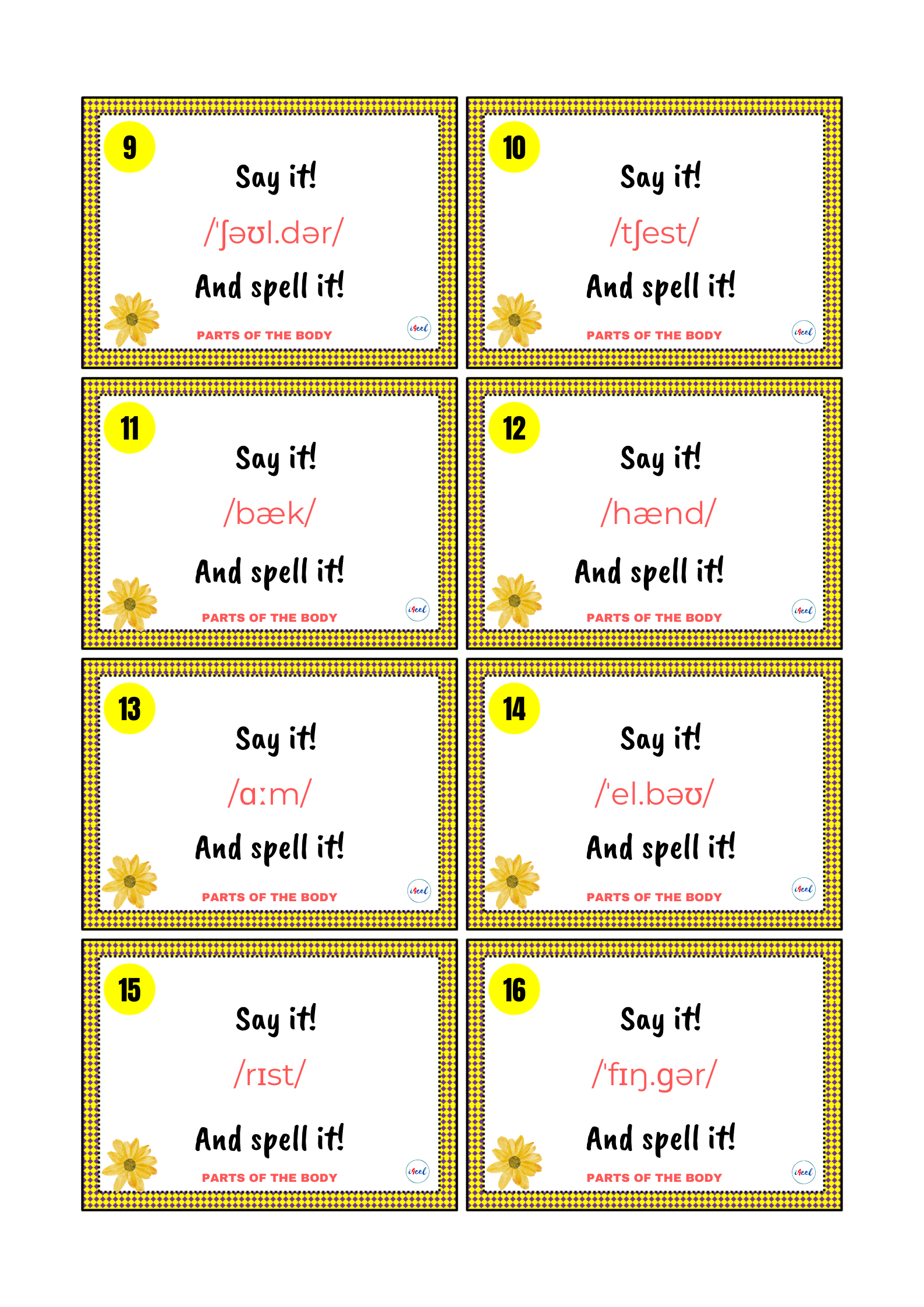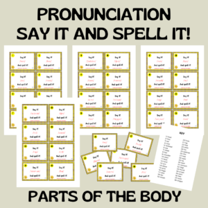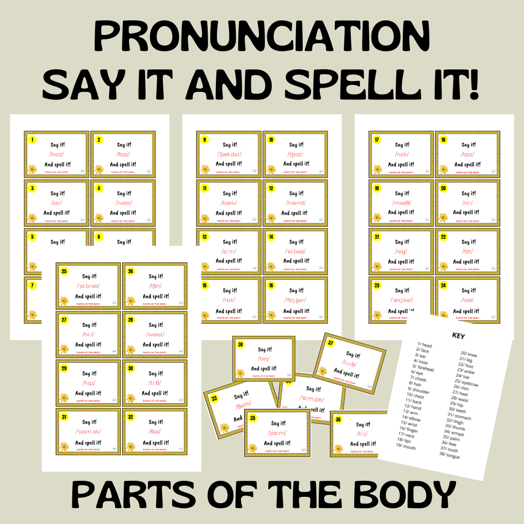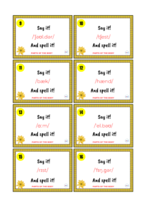Na tych kartach znajdziecie 38 wyrazów z zakresu tematycznego CZĘŚCI CIAŁA, ale wyłącznie w zapisie fonetycznym. Zadaniem ucznia jest (prawidłowo) odczytać słowo i przeliterować je (SAY IT! AND SPELL IT!).