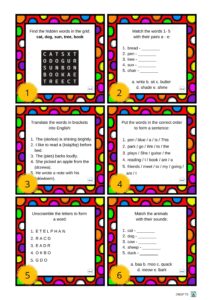 40 kart z zagadkami / ćwiczeniami / łamigłówkami dla młodszych uczniów.