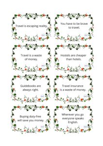 48 kart do konwersacji o stereotypach związanych z podróżowaniem i zakupami.