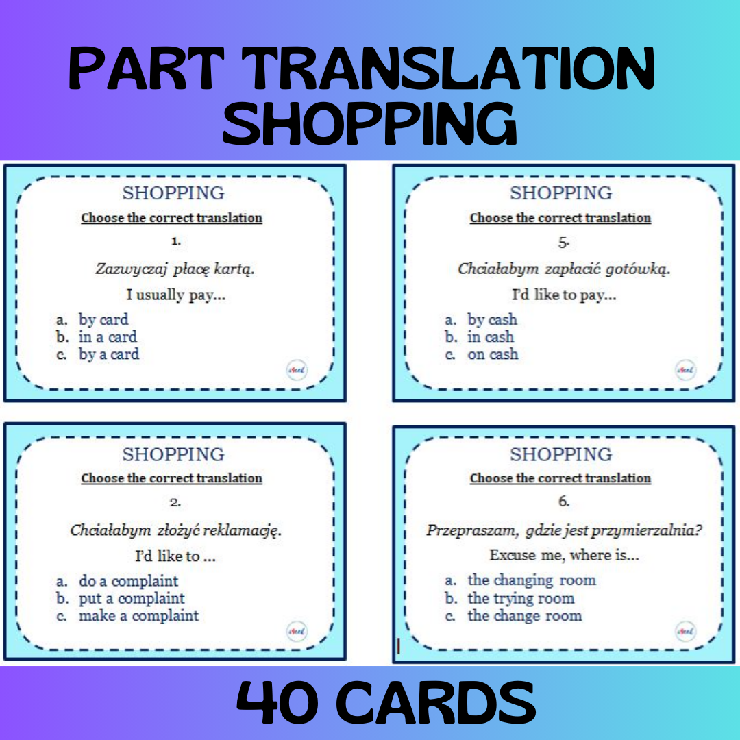 40 kart (8 na stronę, plus karta z odpowiedziami i rewers) z tematyki ZAKUPY.