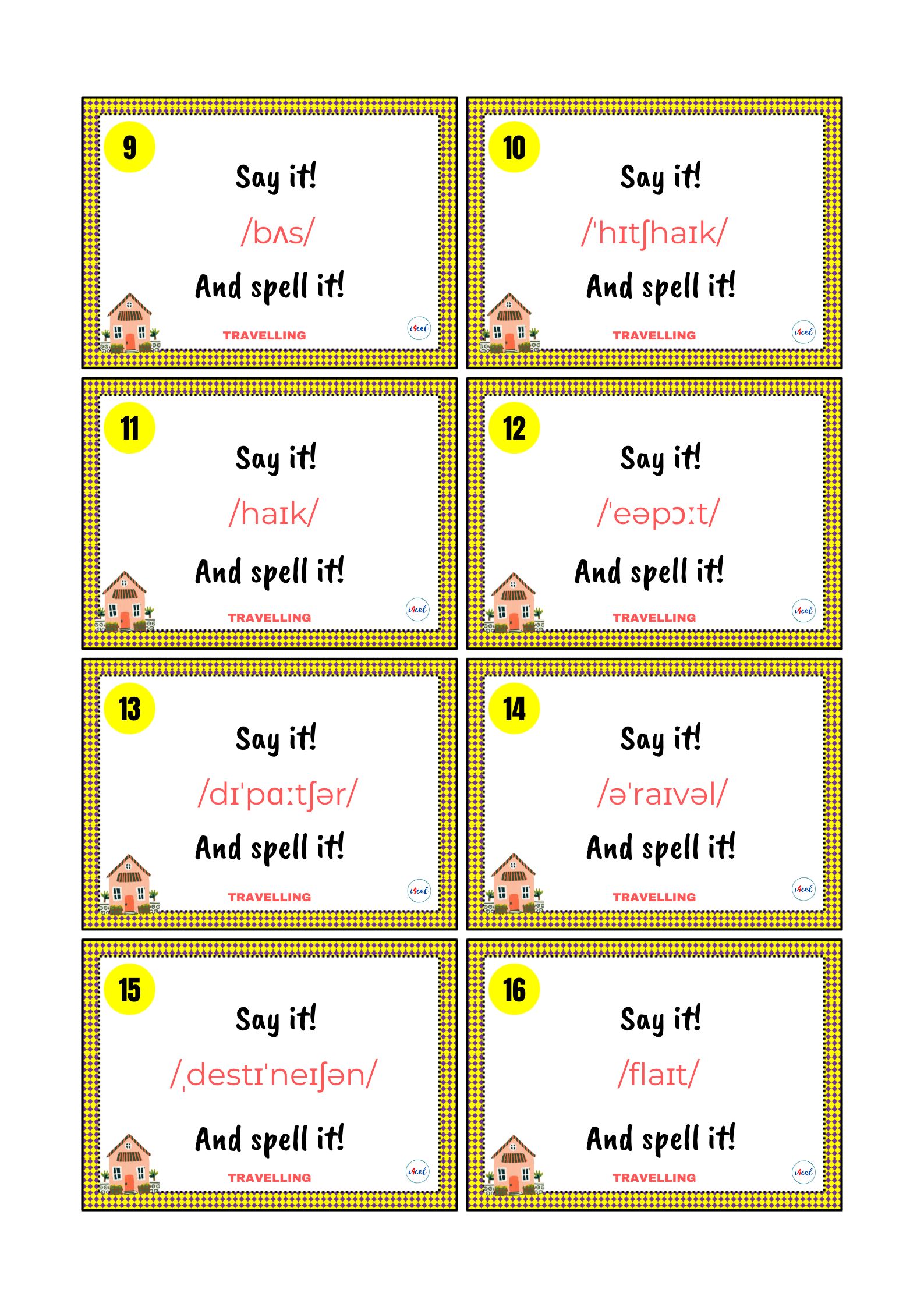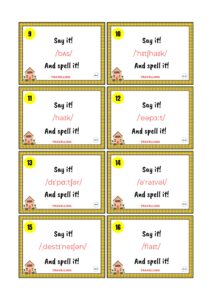 Na tych kartach znajdziecie 56 wyrazów z zakresu tematycznego PODRÓŻOWANIE, ale wyłącznie w zapisie fonetycznym. Zadaniem ucznia jest (prawidłowo) odczytać słowo i przeliterować je (SAY IT! AND SPELL IT!).
