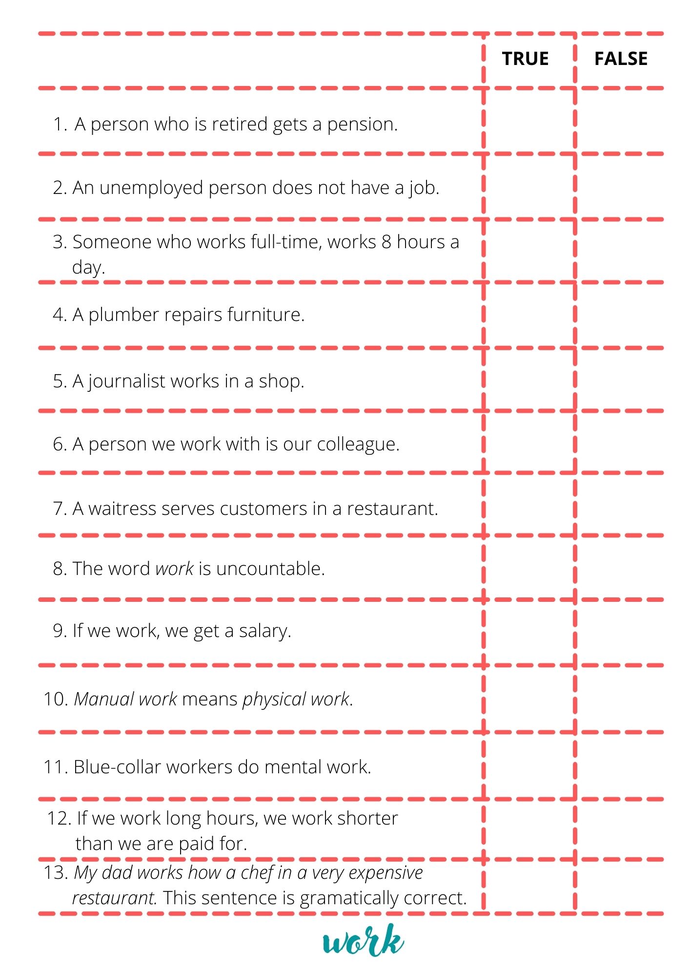 Na każdej stronie 13 zdań w j. angielskim. Zadaniem ucznia jest zaznaczyć, czy zdanie jest TRUE or FALSE. Dodatkowo możemy ucznia poprosić, aby poprawił zdanie błędne.