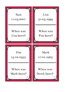 Tasujemy karty i rozdajemy je uczniom (w zależności od liczebności grupy, jeden uczeń może dostać 1 – 4 kart). Grę rozpoczyna uczeń, który ma kartę z napisem START. Uczeń ten odczytuje pytanie na swojej karcie, a uczeń, który ma na nie odpowiedź podaje datę urodzenia w pełnym brzmieniu, czyli np. Susan was born on the tenth of July, nineteen eighty-four.