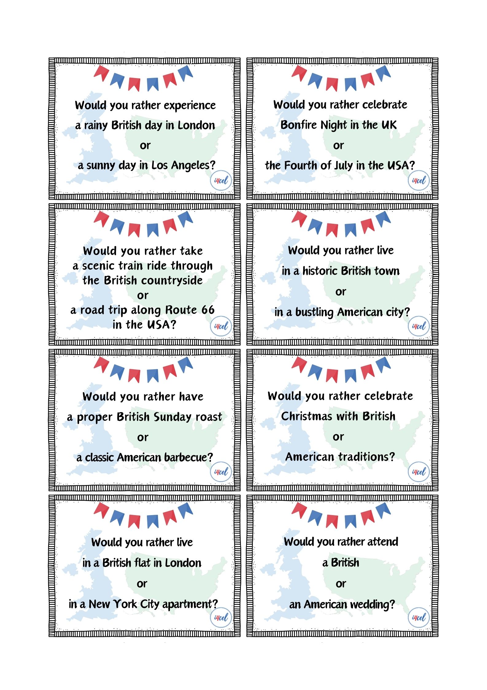 Te i wiele innych pytań znajdziecie na tych karteczkach (w sumie 40, jedna karteczka, jedno pytanie), które mogą być punktem wyjścia do dłuższej dyskusji nt. Wielkiej Brytanii i Stanów Zjednoczonych.